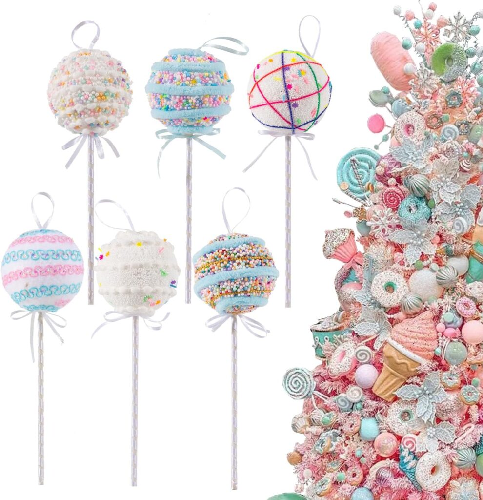 This Candyland Ornament Set ties the theme together by combining sweets, gingerbread styles, and pastel elements. Use them to create a cohesive color palette throughout your tree or spread them around multiple spaces to keep the theme consistent.