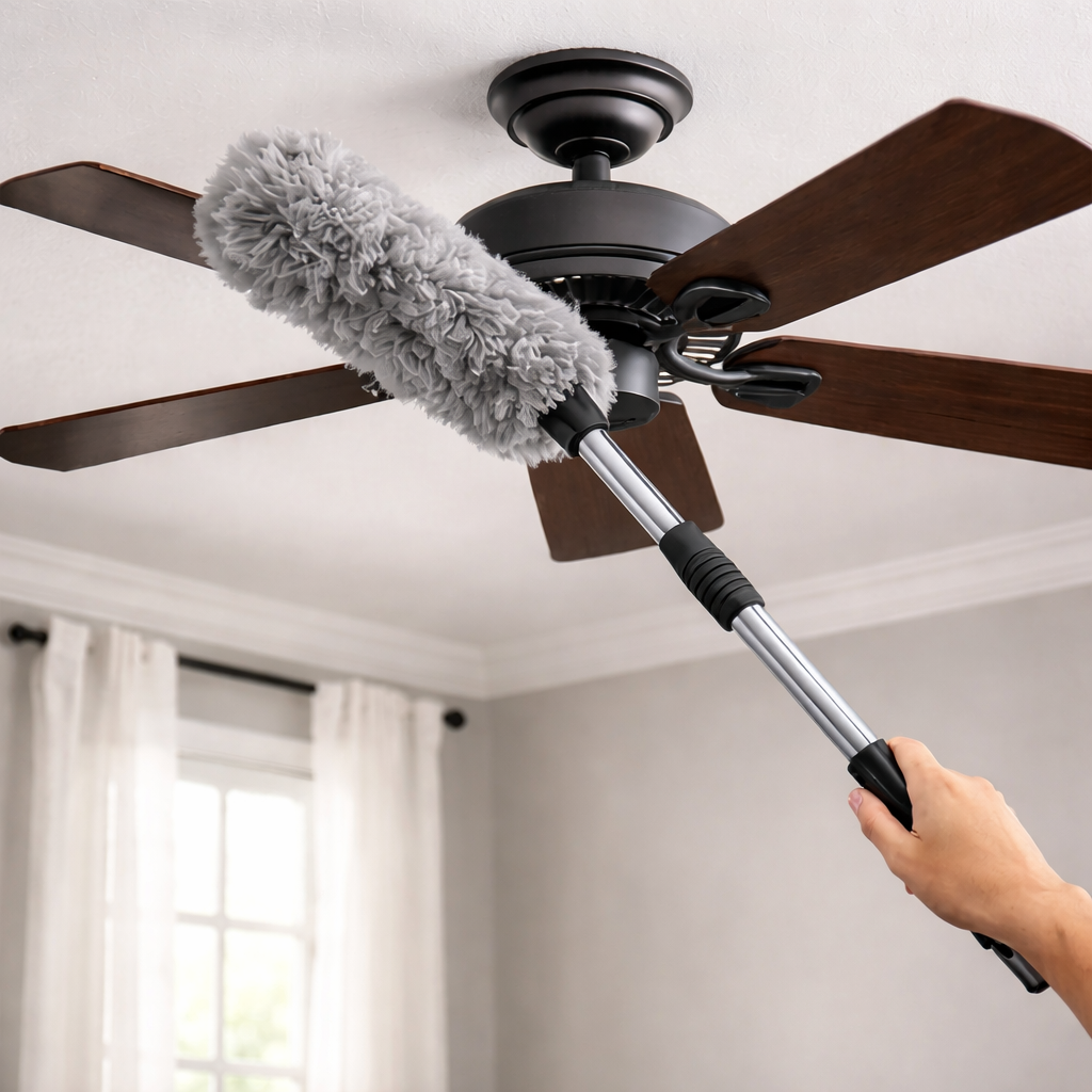 A microfiber duster with an extendable handle helps reach ceiling fans, light fixtures, and high shelves without dragging out a ladder.