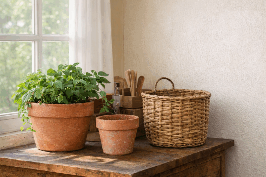 Quick win: Put a terracotta pot near a sunny window, add a small plant, and style it with one glass vase and a woven tray. Done.