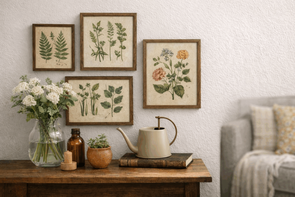 • Botanical prints (pressed flowers, herbs, vintage seed art)